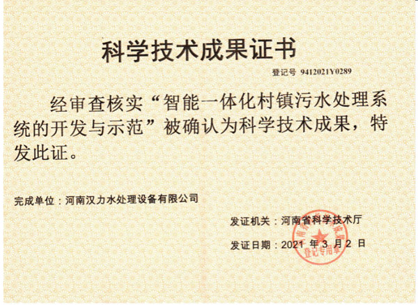 经审查核实“智能一体化村镇污水处理系统的开发与示范”被确认为科学技术成果,特发此证